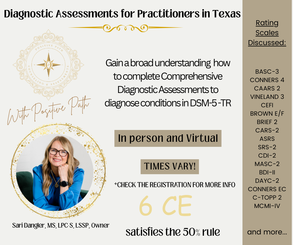 Join the interactive comprehensive training led by Sari Dangler, MS, LPC-S, LSP, focused on learning how to complete Comprehensive Diagnostic Assessments for children and adults using DSM-5-TR criteria. This workshop covers ethical and state testing rules, psychometric principles, essential assessment components, and the use of online rating scales across multiple areas of functioning. Participants will explore differential diagnosis processes and appropriate assessment tools for major conditions such as Autism, ADHD, Anxiety, Depressive, and Learning Disorders, while gaining familiarity with key diagnostic instruments and guidance for further professional training.