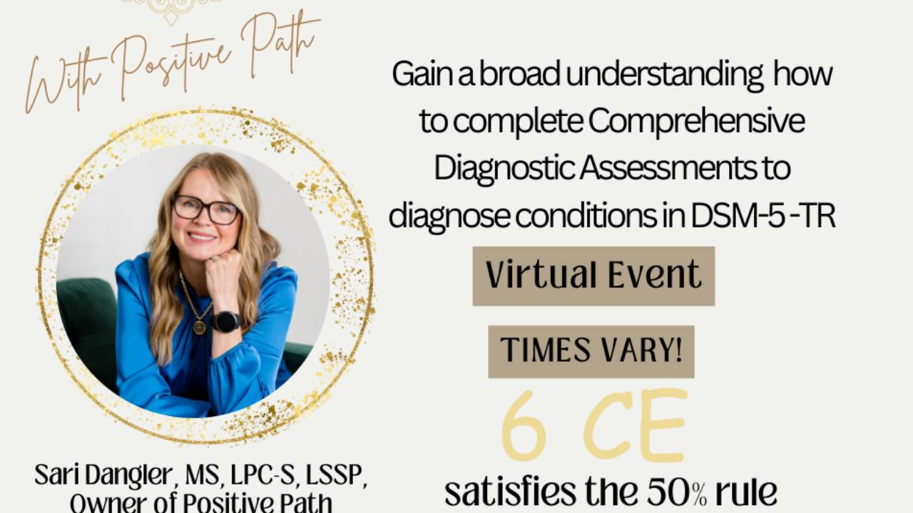 Work on you own pace on a comprehensive training led by Sari Dangler, MS, LPC-S, LSP, focused on learning how to complete Comprehensive Diagnostic Assessments for children and adults using DSM-5-TR criteria. This workshop covers ethical and state testing rules, psychometric principles, essential assessment components, and the use of online rating scales across multiple areas of functioning. Participants will explore differential diagnosis processes and appropriate assessment tools for major conditions such as Autism, ADHD, Anxiety, Depressive, and Learning Disorders, while gaining familiarity with key diagnostic instruments and guidance for further professional training.